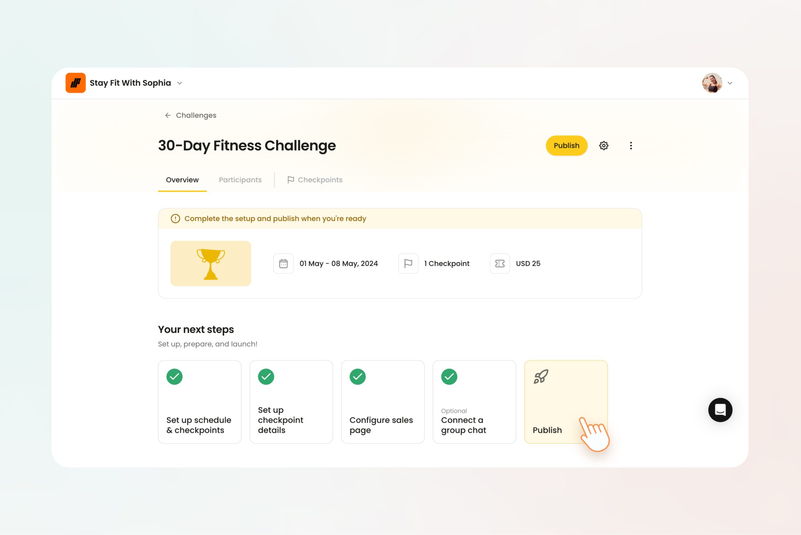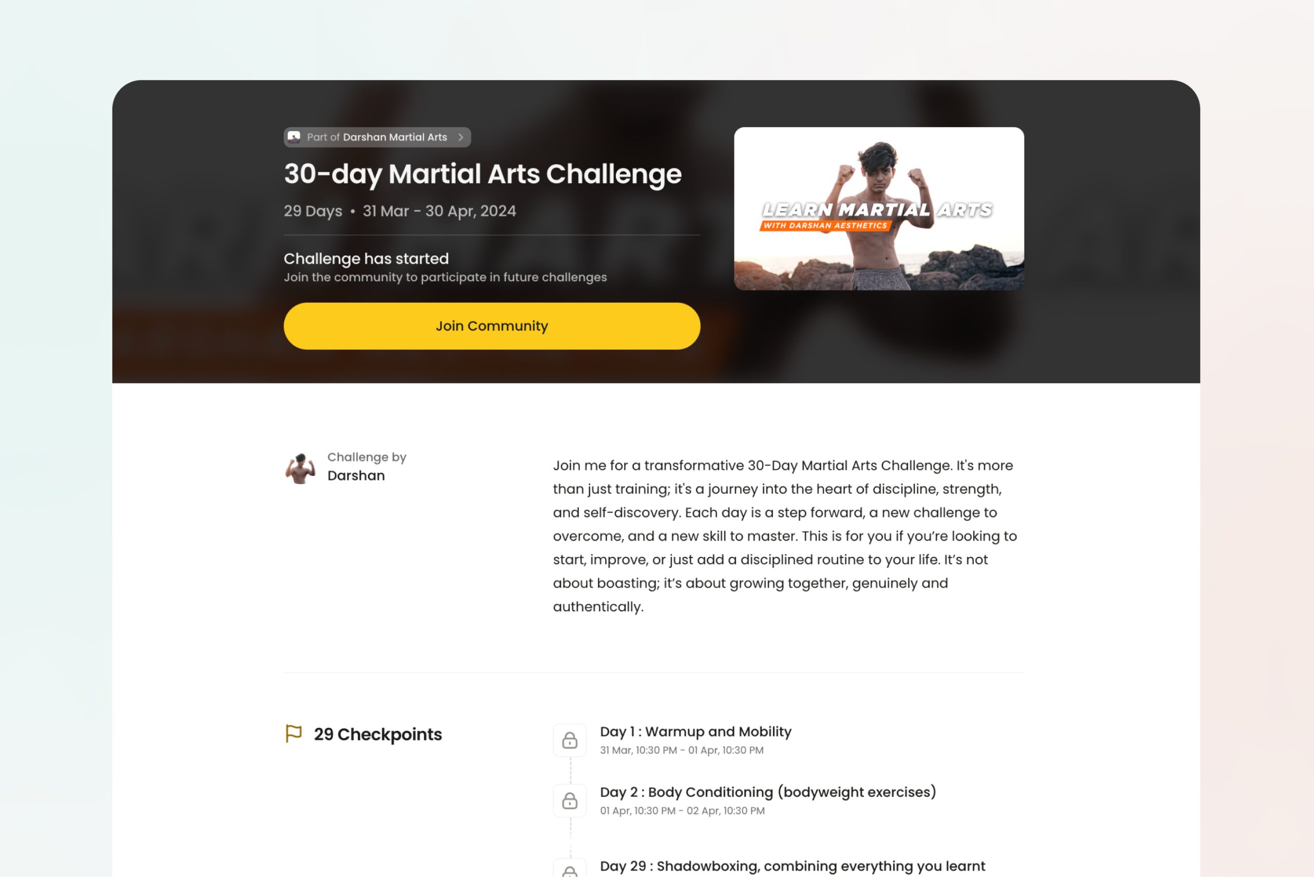 They just have to go to the “Challenges” tab and select your challenge to get to the landing page. It’s where they can find all the details they need like the duration, number of checkpoints, and the countdown timer so they can set a reminder.