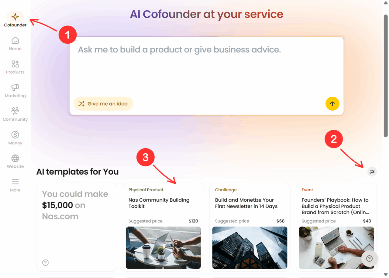 After signing up, head over to the “Cofounder” tab (1) in the left sidebar. This will take you to your AI workspace, where you can generate business ideas and products. Next, click on the profile settings button (2) to refine your profile.