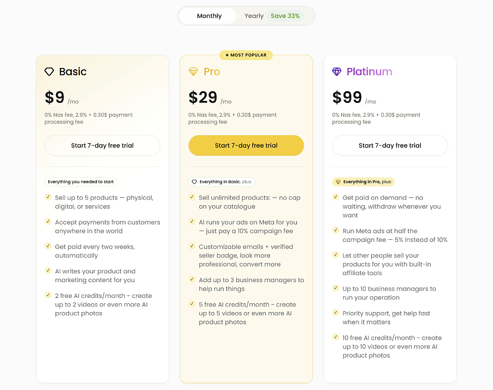 | Nas.com | AI product templates, memberships, community engagement tools, live events, challenges and Zero Link. | $9 – $99/mon (2.9% + 0.30$ payment processing fee) |