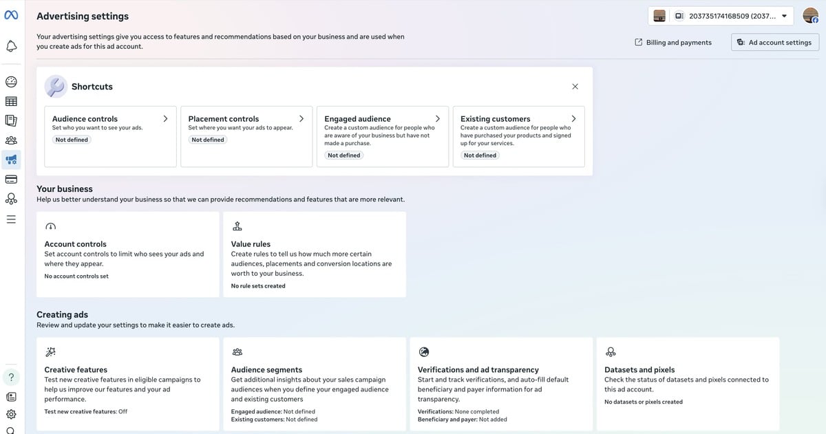 - Cuenta Publicitaria: Aquí se gestionan la facturación, los límites de gasto y los datos de las campañas.